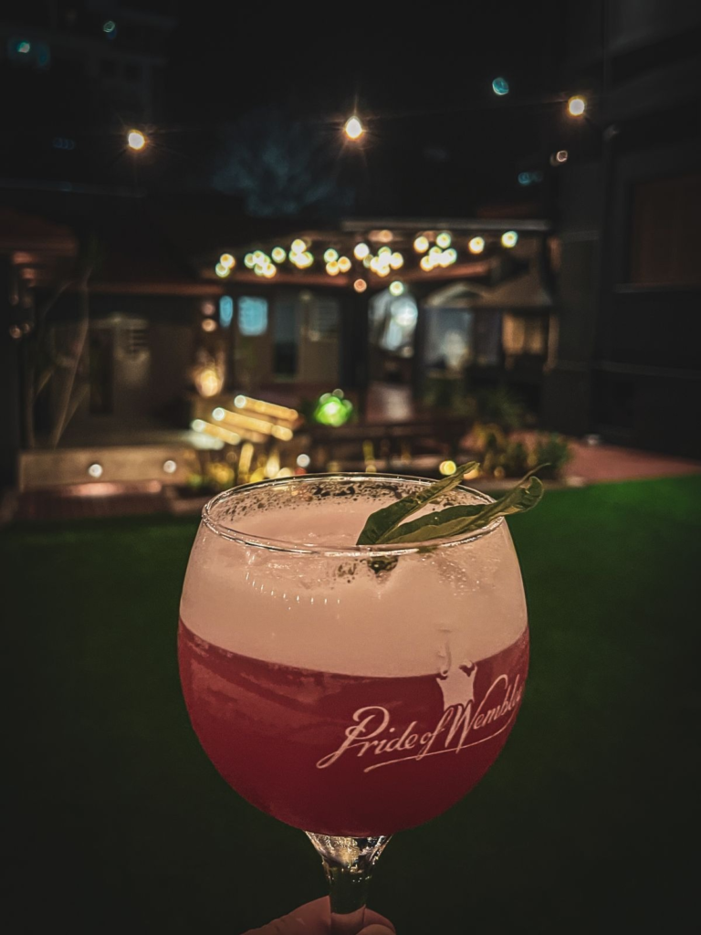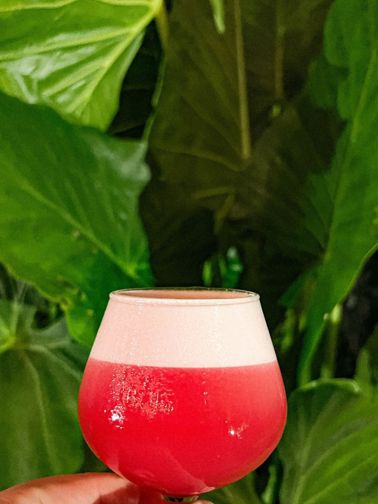 VODKA COM HIBISCO, SUCO DE LIMÃO, XAROPE SIMPLES, CLARA DE OVO E ESPUMANTE BRUT.