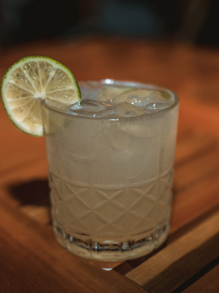 GIN, SUCO DE LIMÃO, XAROPE SIMPLES E ÁGUA COM GÁS.