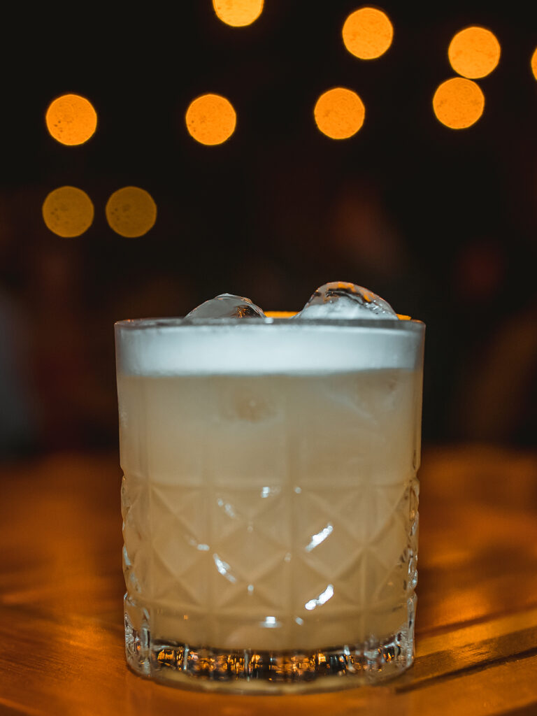 WHISKY, SUCO DE LIMÃO, XAROPE SIMPLES E CLARA DE OVO.
