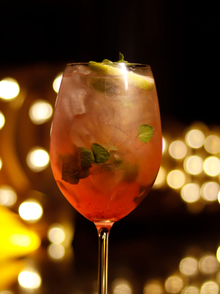 Xarope de morango, Vodka, Hortelã, e Água com gás
