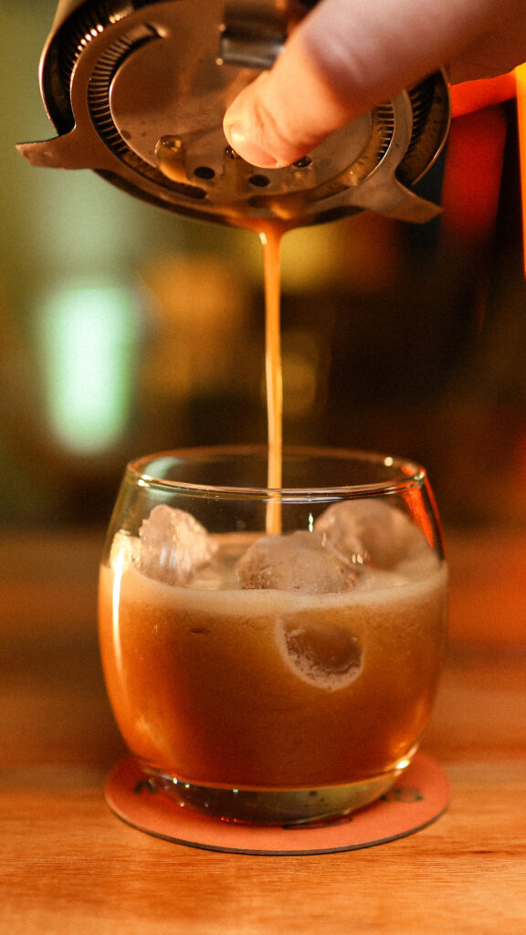 licor 43, café, suco de limão, angostura de laranja e angostura de cacau.